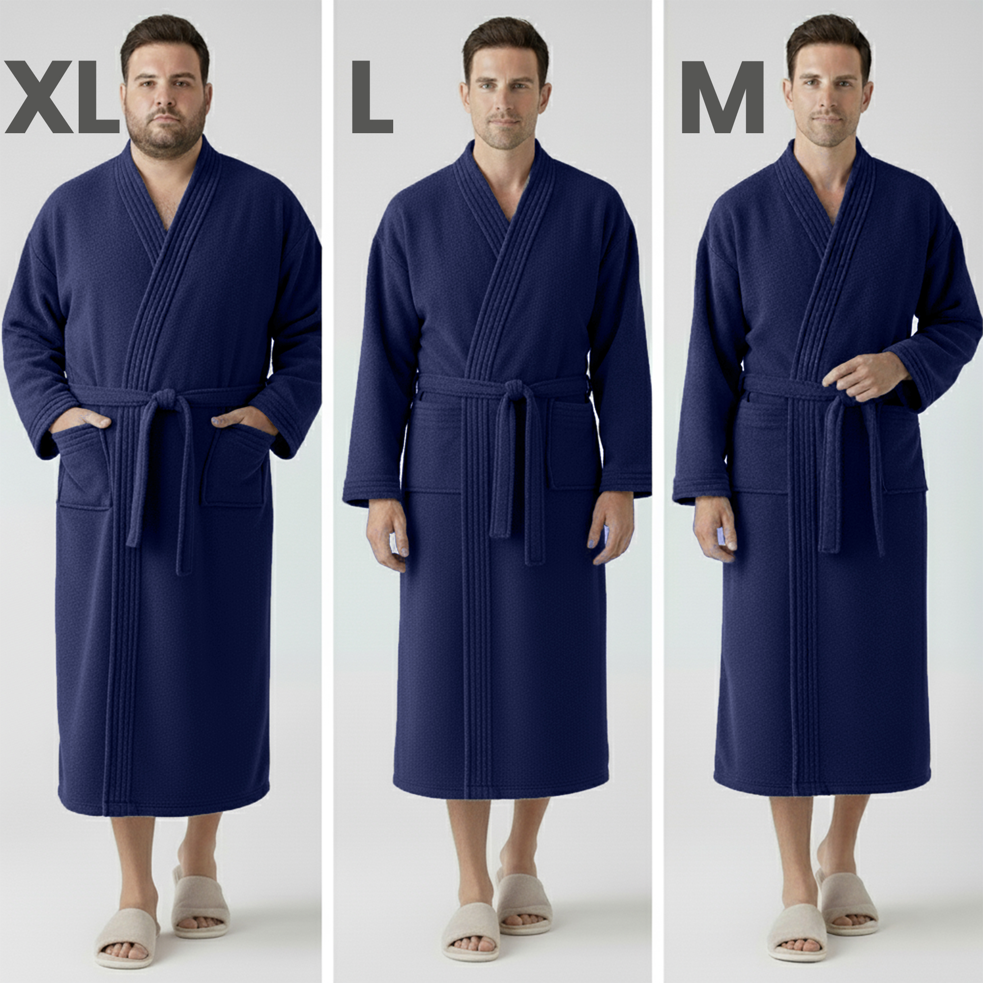 Canadian Linen offers this luxury kimono bathrobe in three comfortable sizes: Medium, Large, and X-Large. Each size provides enough room for relaxed movement while maintaining a neat fit. The waist belt can be adjusted to suit personal comfort, allowing anyone to wear it with ease.