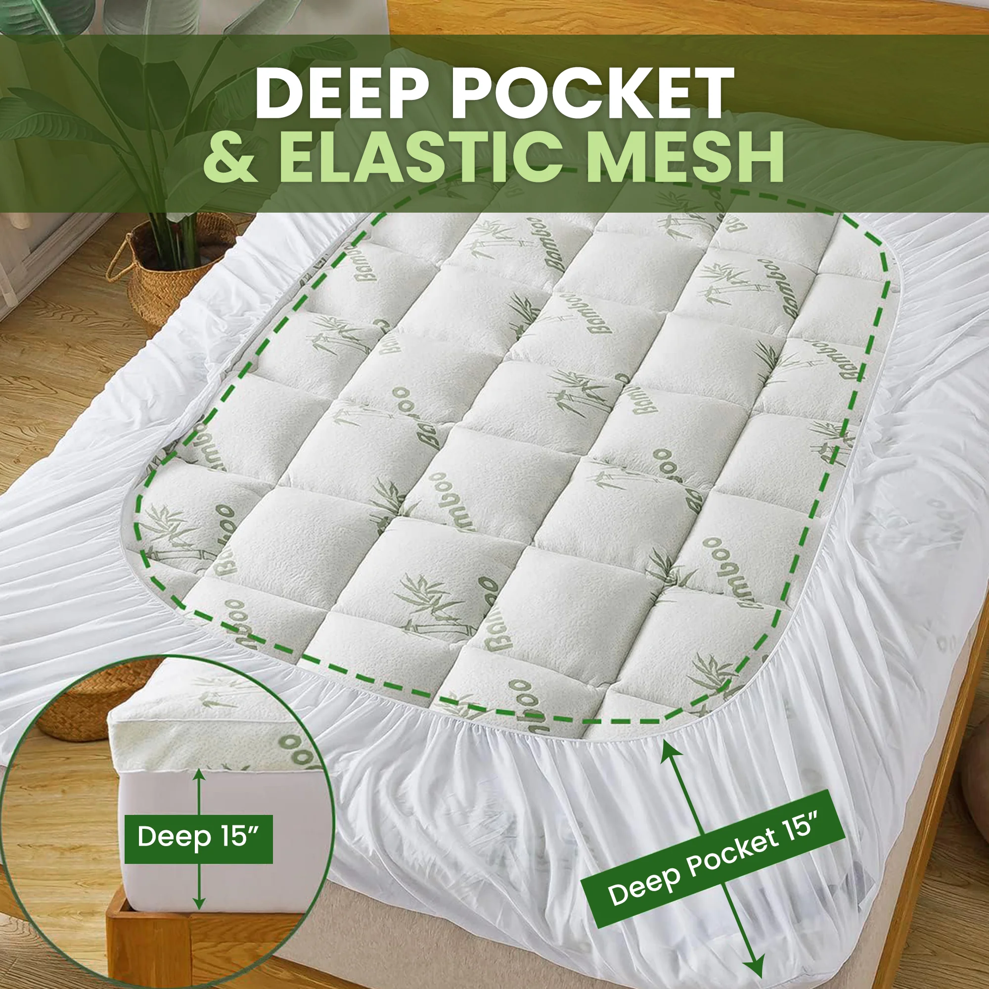 Premium Bamboo Fabric Mattress Topper – Queen, 60″X80″X15″