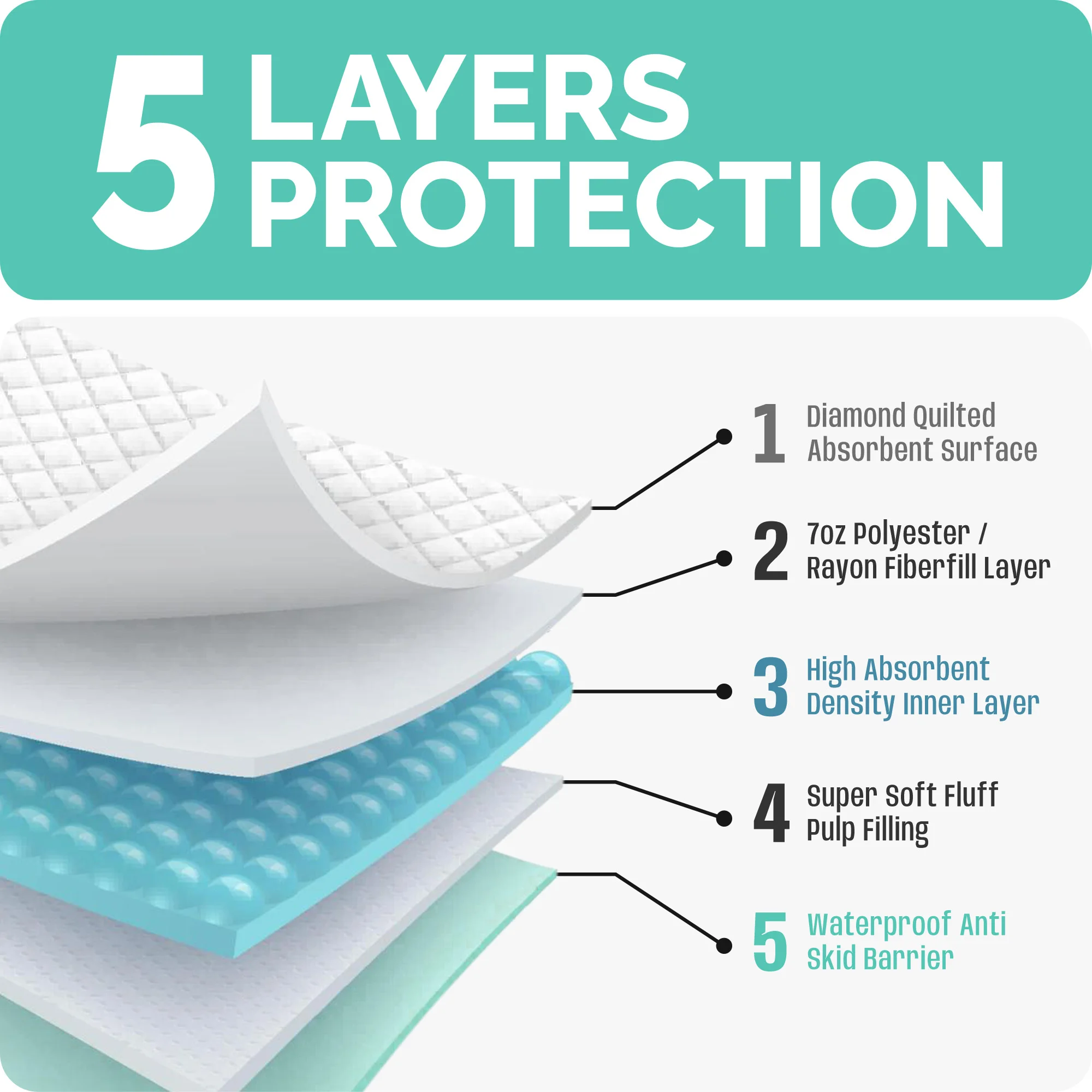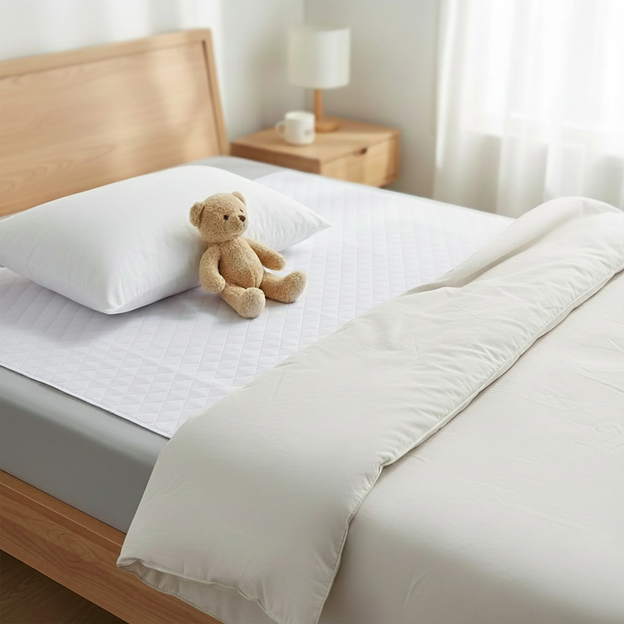 • Hygienx premium waterproof bed pads available in multiple sizes, designed with layered construction for strong absorbency and durability.